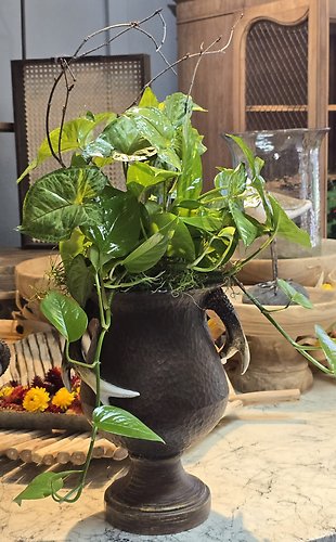 Rustic urn with antler handles holds green plants.